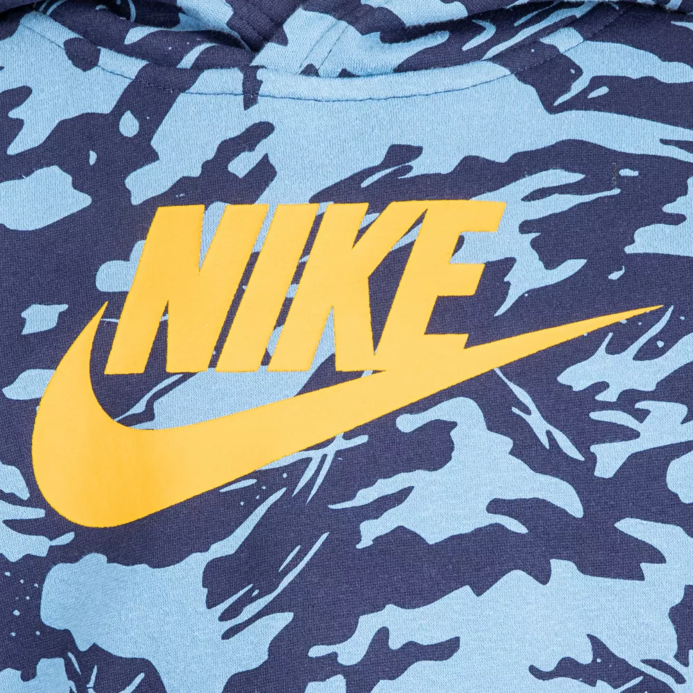 Keep him cozy and camouflaged in this warm boys’ Nike Club camo fleece pullover hoodie.