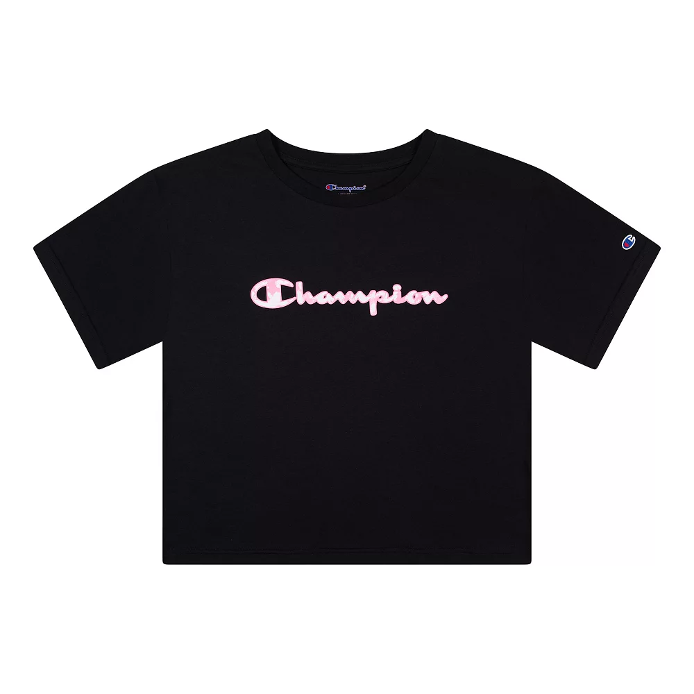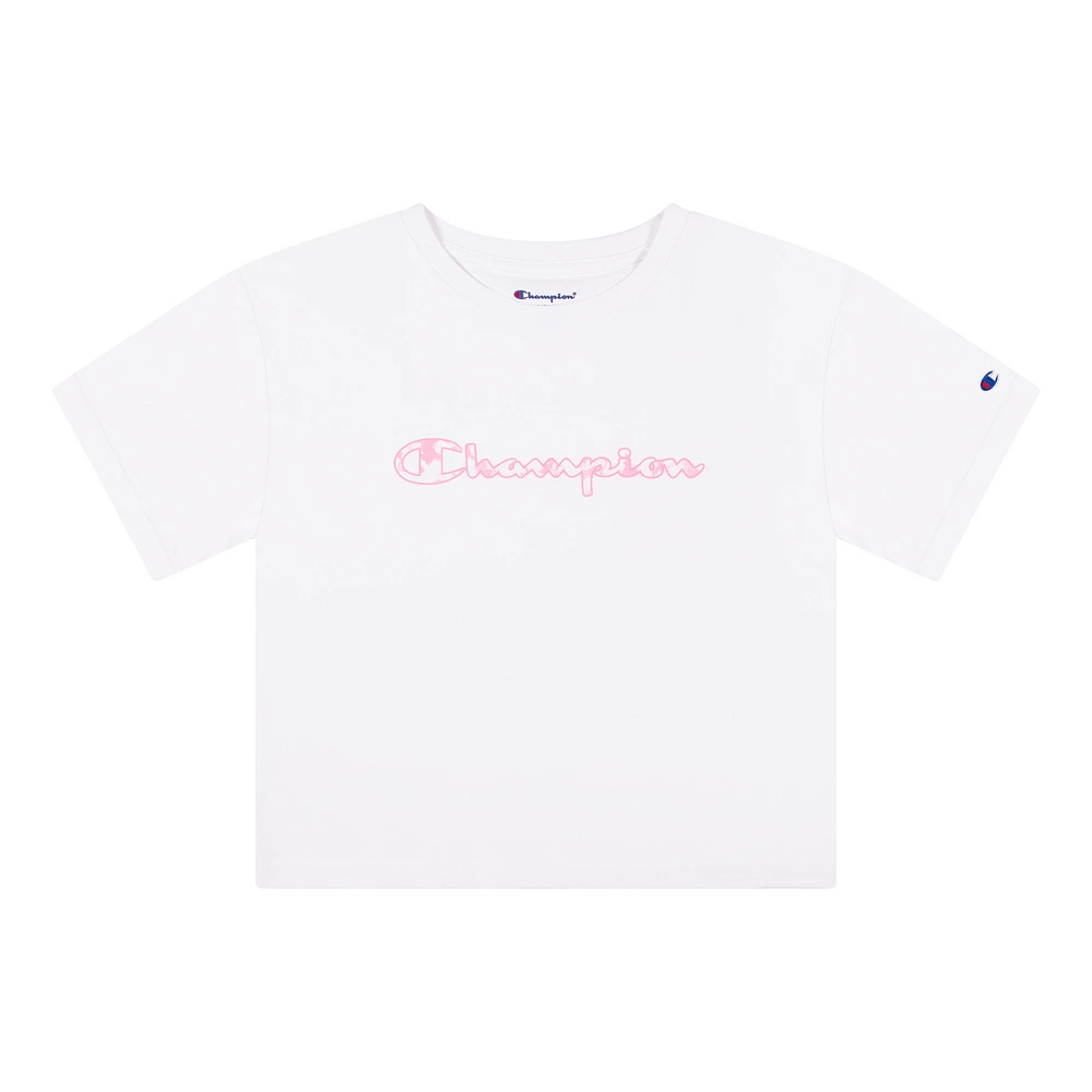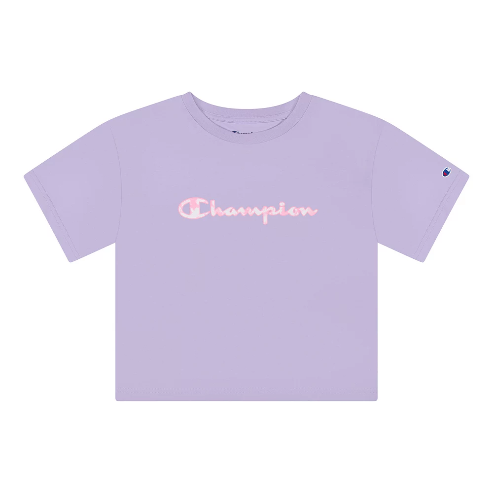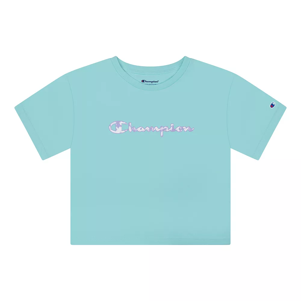 This Champion girls’ tee features a cool tie-dye script graphic.