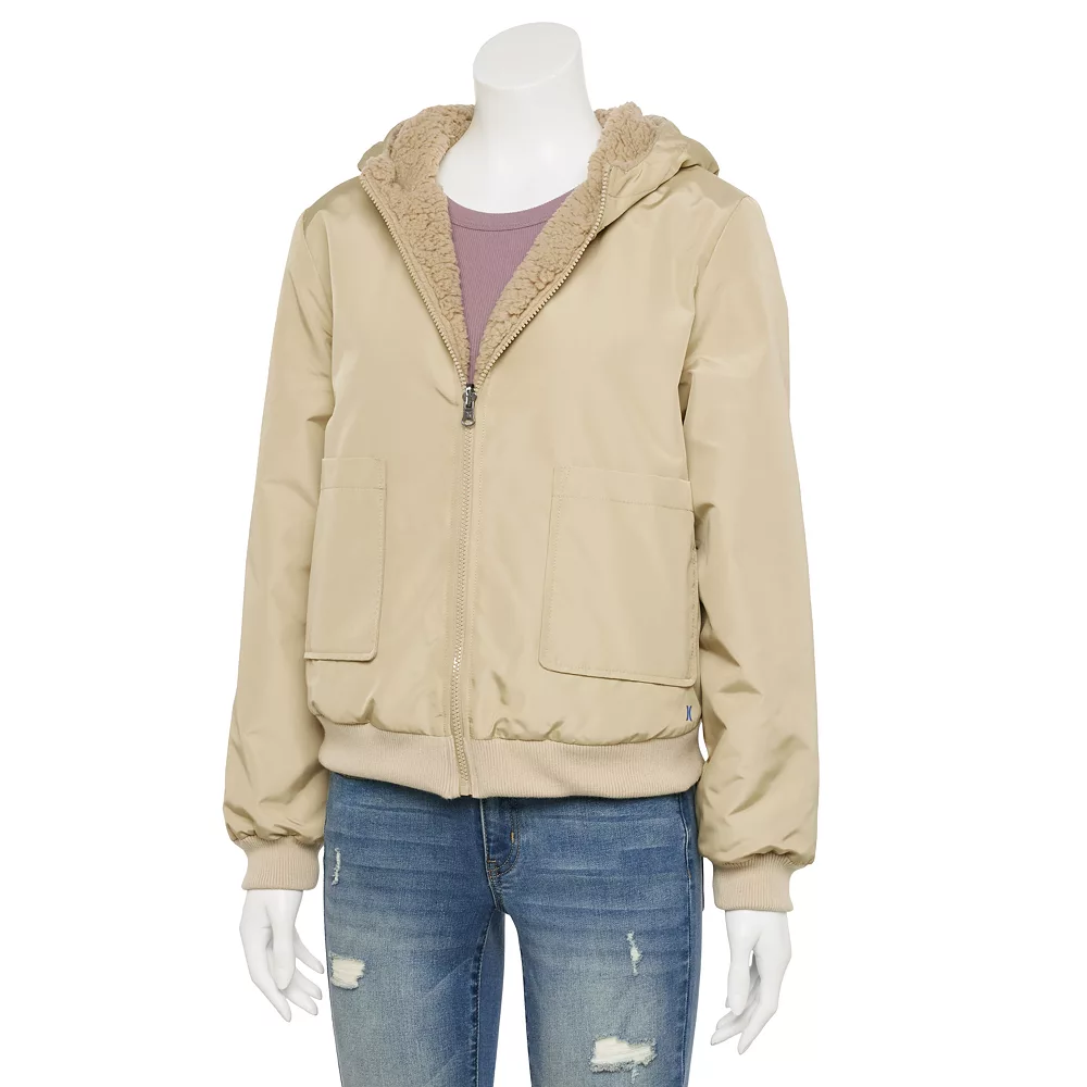Stay comfy and cozy (but still stylish) during the colder months with this adorable reversible juniors’ sherpa bomber jacket from Hurley.