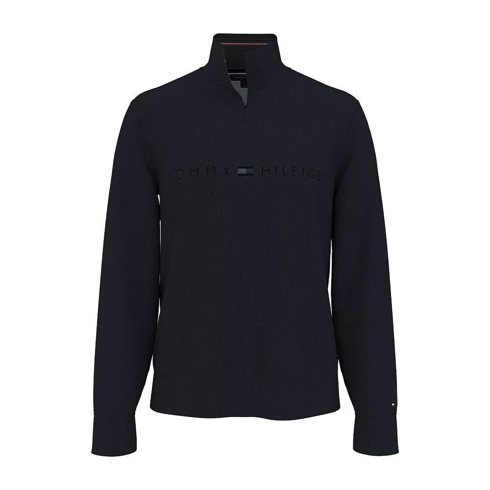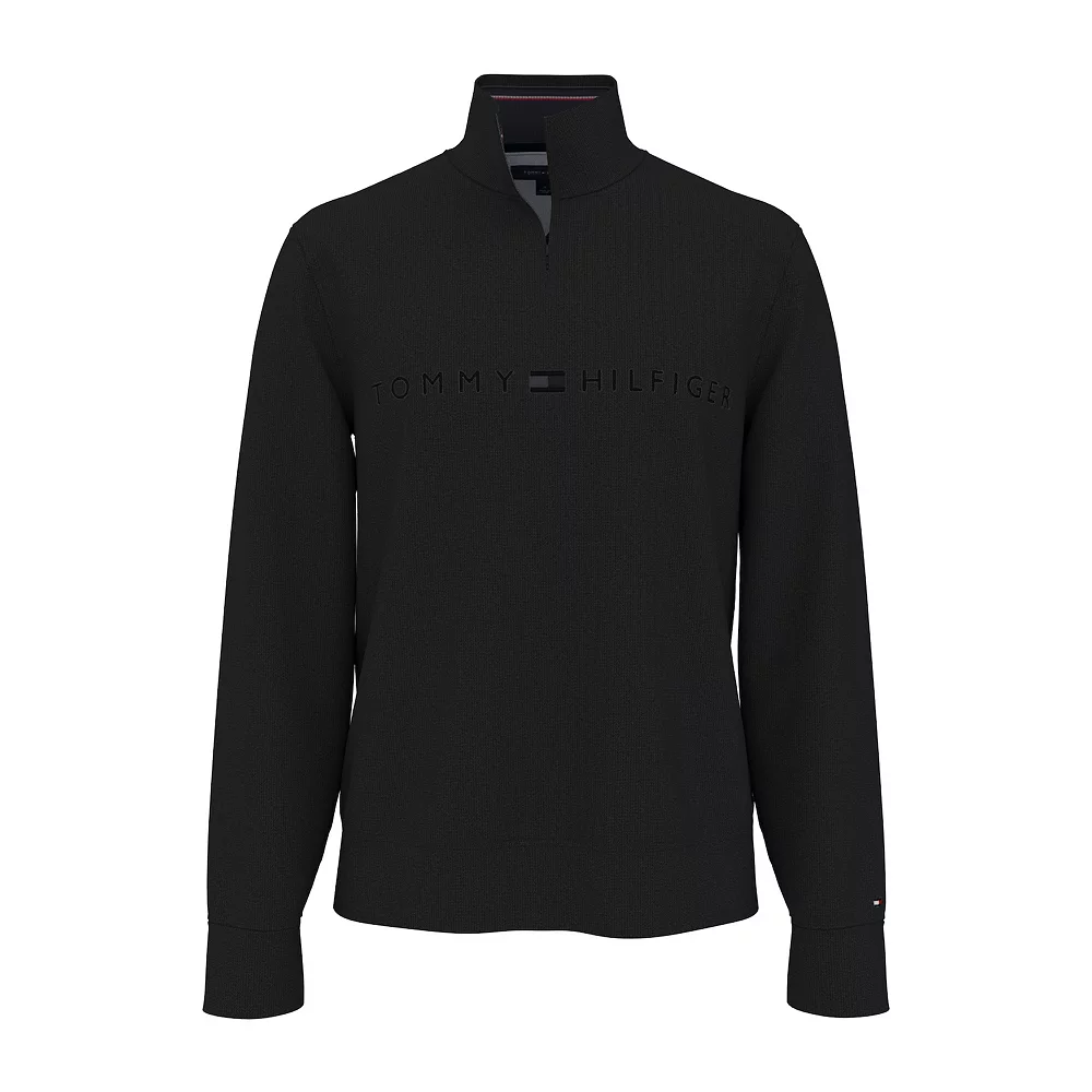 Keep your style elevated even when you need to layer for warmth. This men’s Tommy Hilfiger tonal logo quarter zip pullover has got you covered.